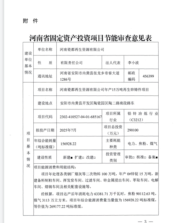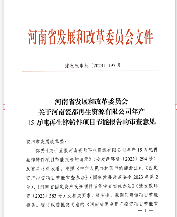 河南省发展和改革委员会 关千河南瓷都再生资源有限公司年产 15 万吨再生锌铸件项H节能报告的审查意见