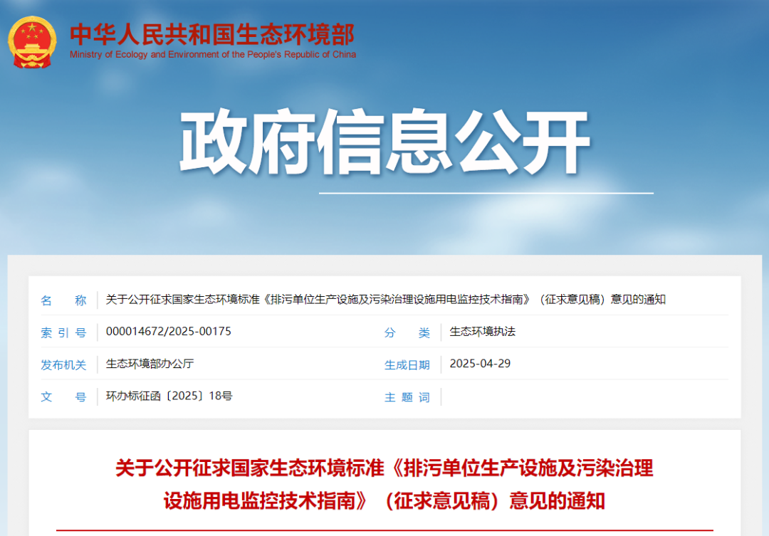 生态环境部印发《排污单位生产设施及污染治理设施用电监控技术指南(征求意见稿)》